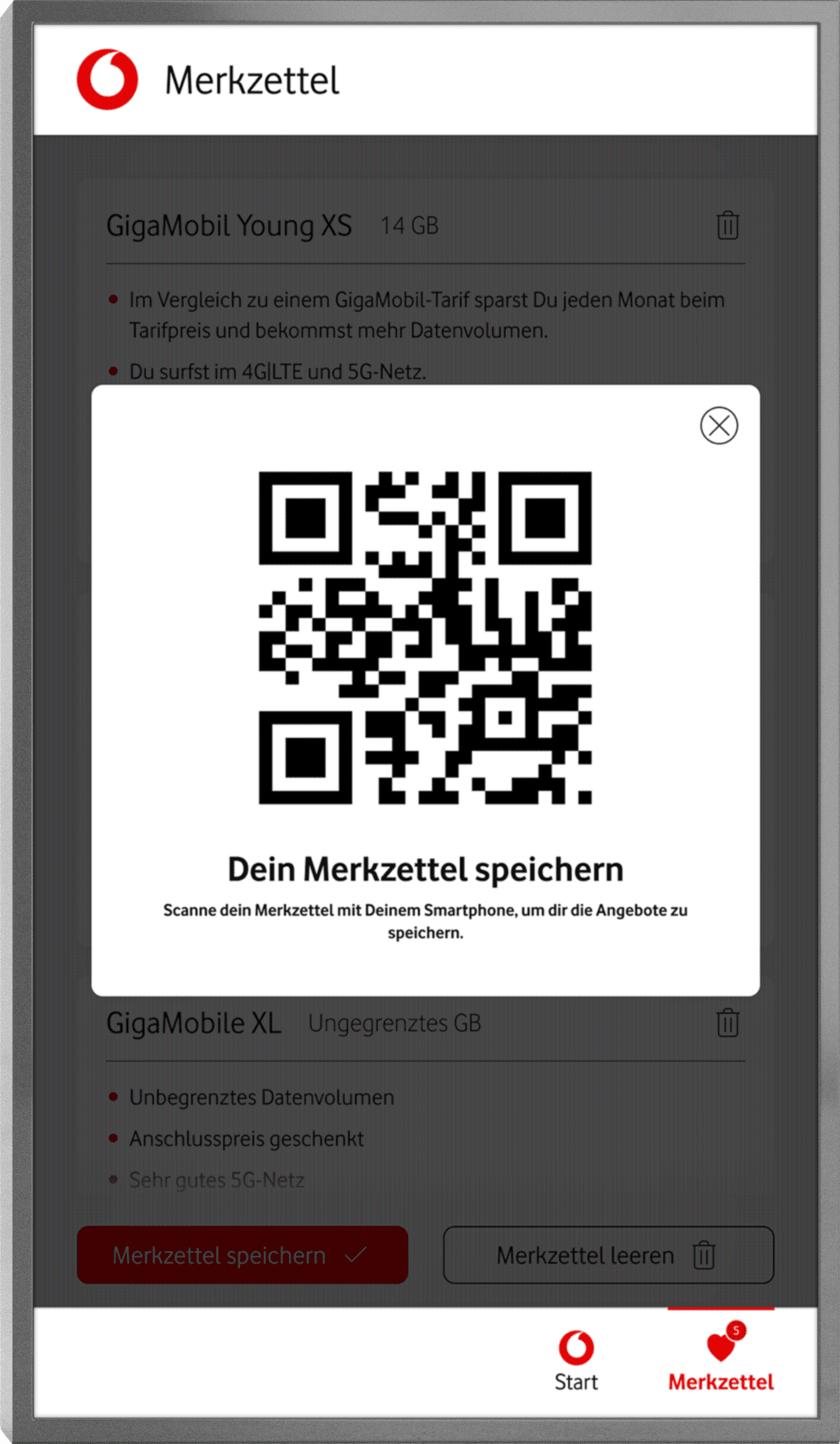 Kund*innen können am Screen relevante Inhalte einfach sammeln, etwa passende Tarife oder Services und diese per individuell generiertem QR-Code direkt auf ihr Smartphone mitnehmen.